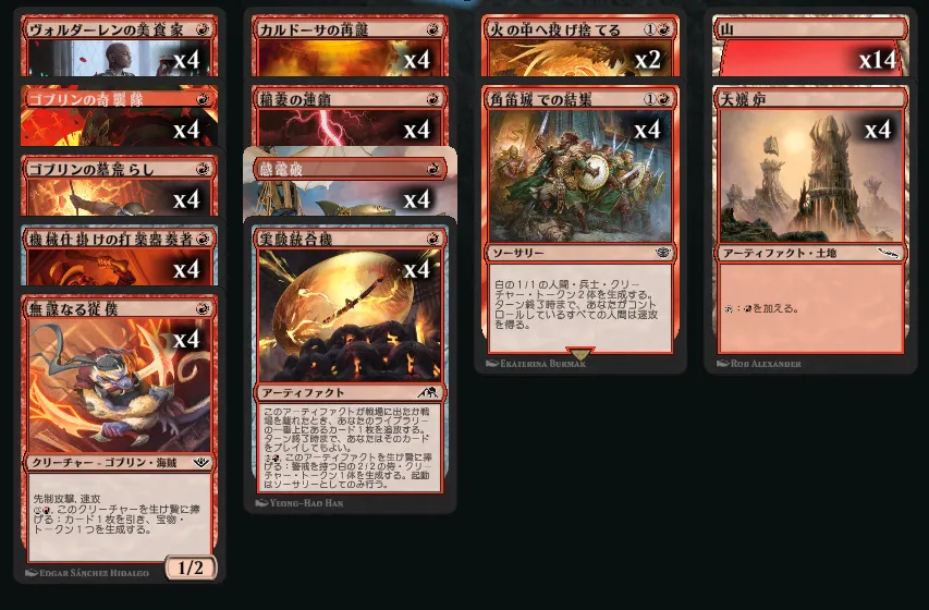 大量の1マナクリーチャーが採用されており、横並べからの《ゴブリンの奇襲隊》キッカーで全体強化を掛けて一気に決めます。