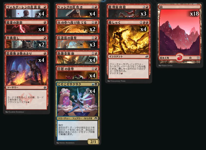 前述のカルドーサレッドと違いバーンよりの構成になっており、《信仰なき者あさり》を使って手札を整えつつ、高速で相手のライフを削っていきます。