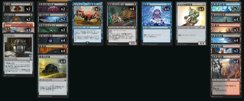 「久遠の終端」にてアーティファクト・土地が揃い、1マナ4点の《感電波》も収録されたので、一気に安定性が増したアーティファクト特化のデッキです。