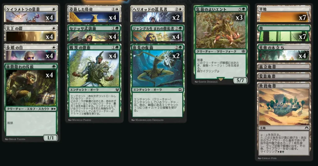 呪禁を持ったクリーチャーにペタペタとオーラを張り付けて殴るというデッキです。最近になって1マナの呪禁クリーチャーが加わり、少しだけパワーアップしました。
