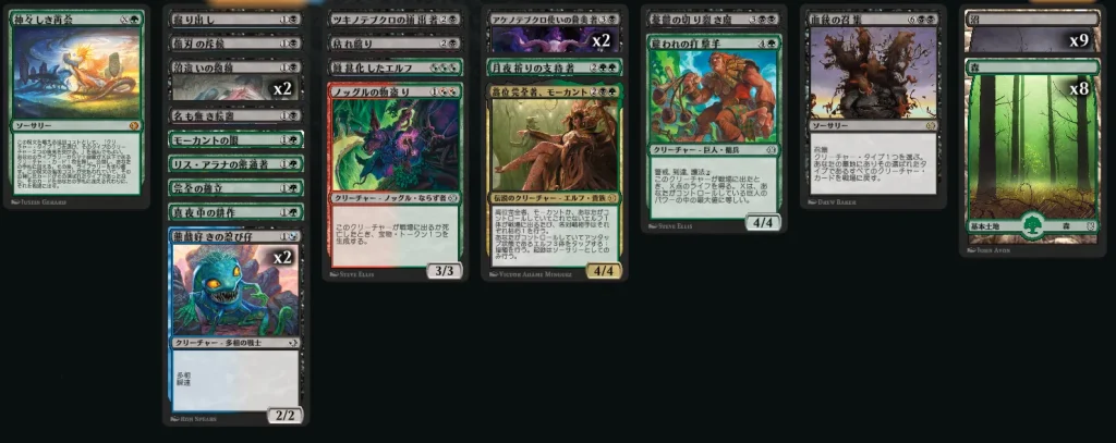 墓地にエルフがないと駄目ですが、2マナの加速はテンポ稼ぎには最適です。積極的な相打ちを肯定してくれますが、切削も併用するとマナ加速を活用しやすいです。