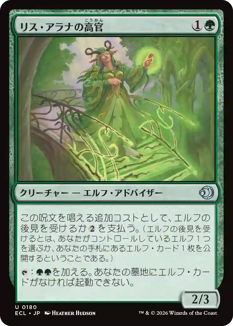 {(T)}:{(G)(G)}を加える。あなたの墓地にエルフ・カードがなければ起動できない。 この呪文を唱える追加コストとして、エルフの後見を受けるか{(2)}を支払う。