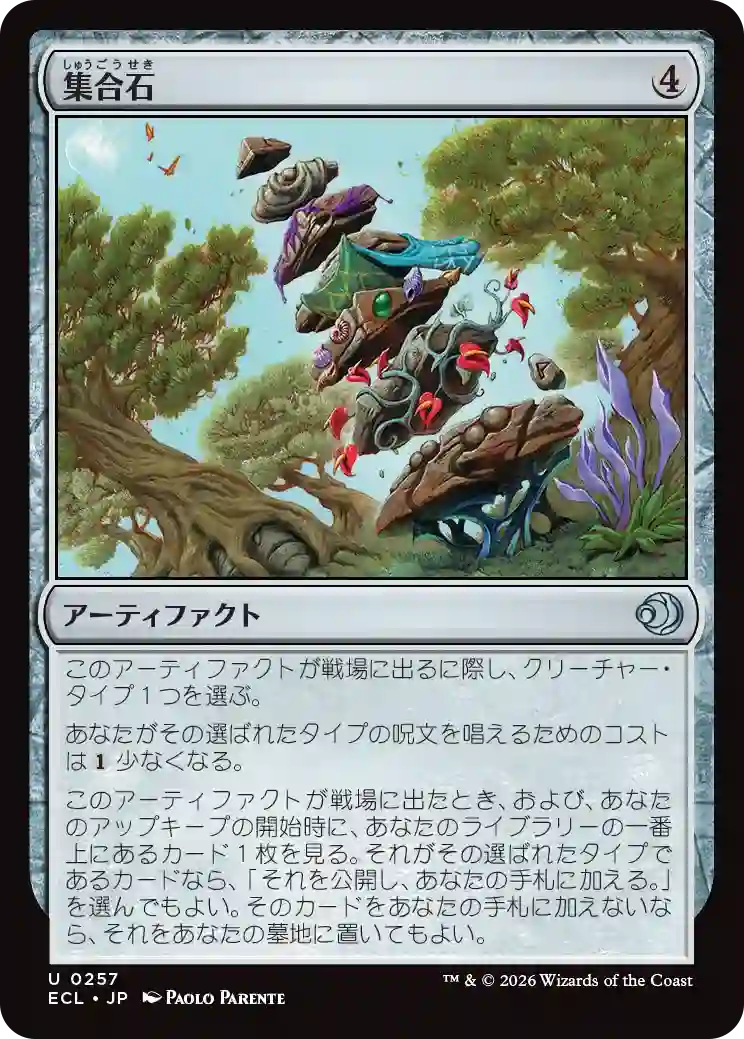 あなたがその選ばれたタイプの呪文を唱えるためのコストは{(1)}少なくなる。 このアーティファクトが戦場に出たとき、および、あなたのアップキープの開始時に、あなたのライブラリーの一番上にあるカード1枚を見る。それがその選ばれたタイプであるカードなら、「それを公開し、あなたの手札に加える。」を選んでもよい。そのカードをあなたの手札に加えないなら、それをあなたの墓地に置いてもよい。 このアーティファクトが戦場に出るに際し、クリーチャー・タイプ1つを選ぶ。