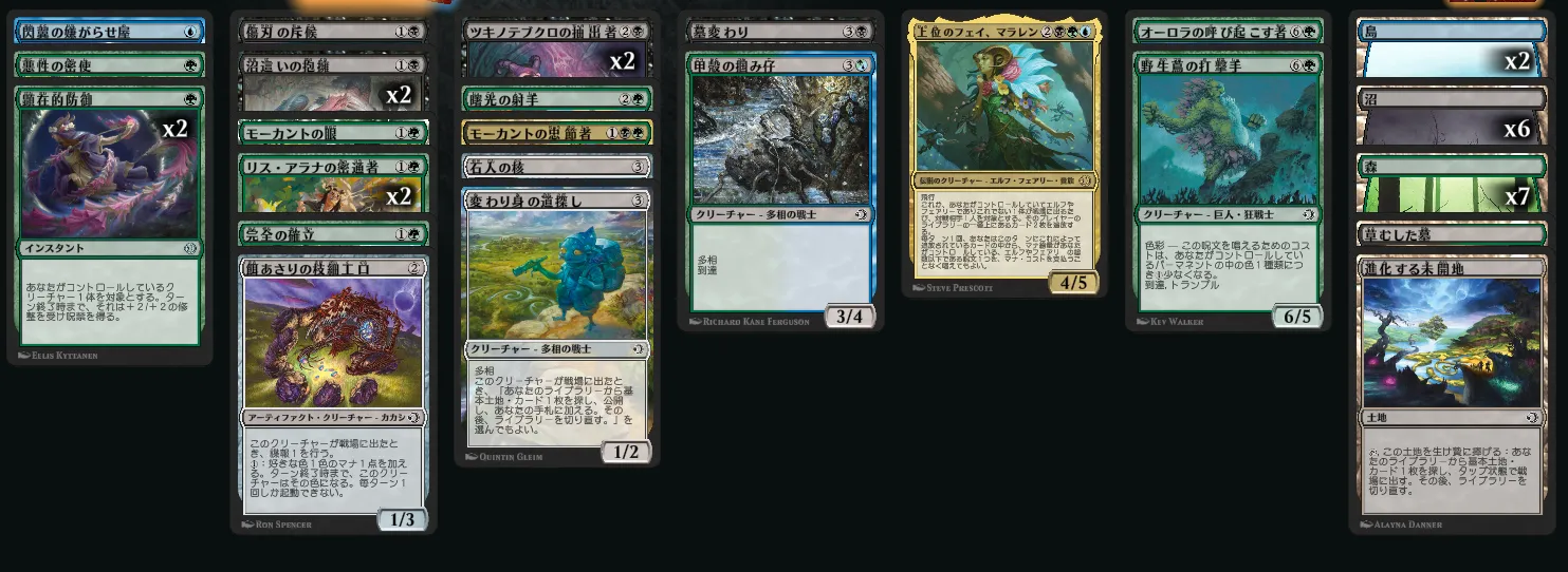 《上位のフェイ、マラレン》が取れたは良いものの、カード不足が顕著だったので、割り切って色マナのサポートに全部を振り分けてしまった回です。