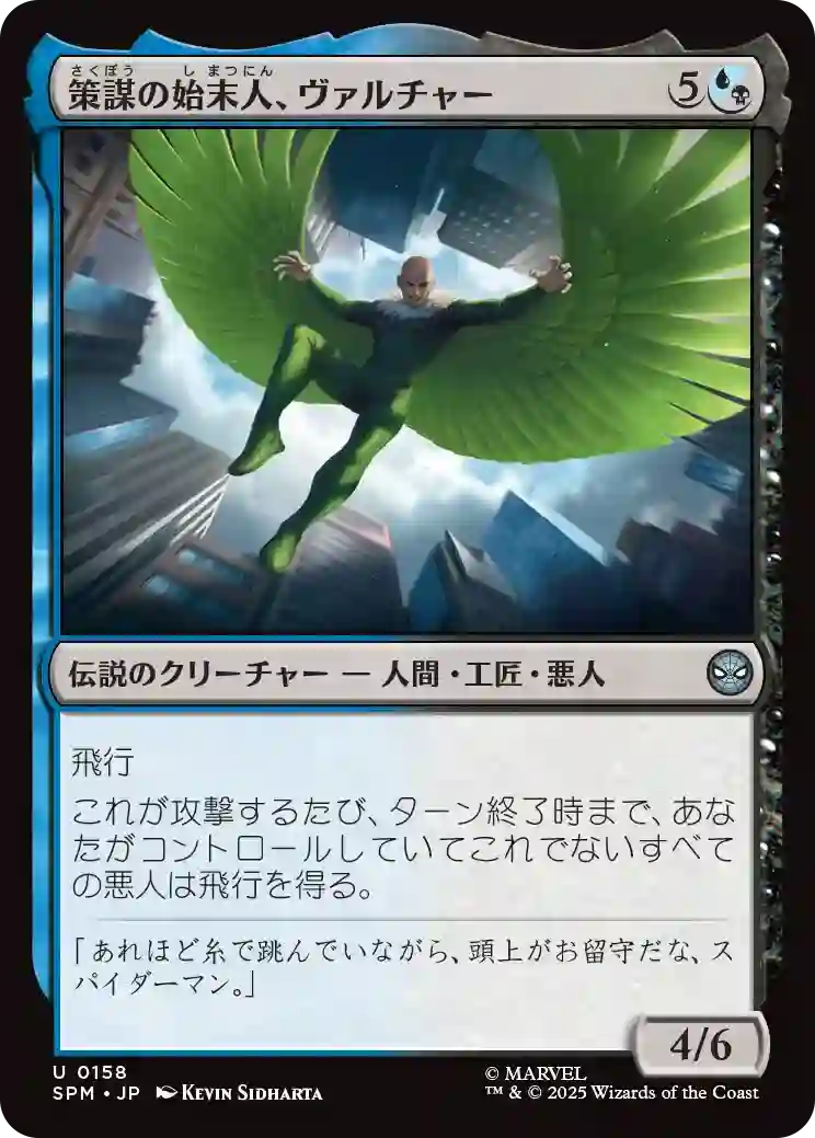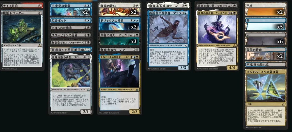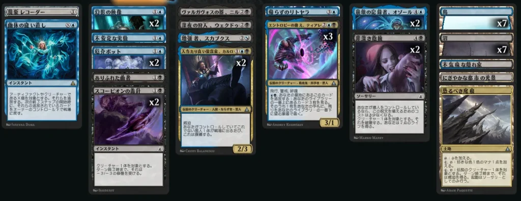 スパイダーマン(領界路の彼方)における青黒デッキの主力カード、および完勝したときのデッキ例です。