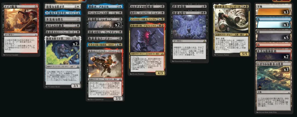 悪人による部族シナジーを利用したデッキで、悪人がいれば黒の除去が強く使えます。また黒のレアがかなり強いので、それを無理なく採用できるのが利点です。