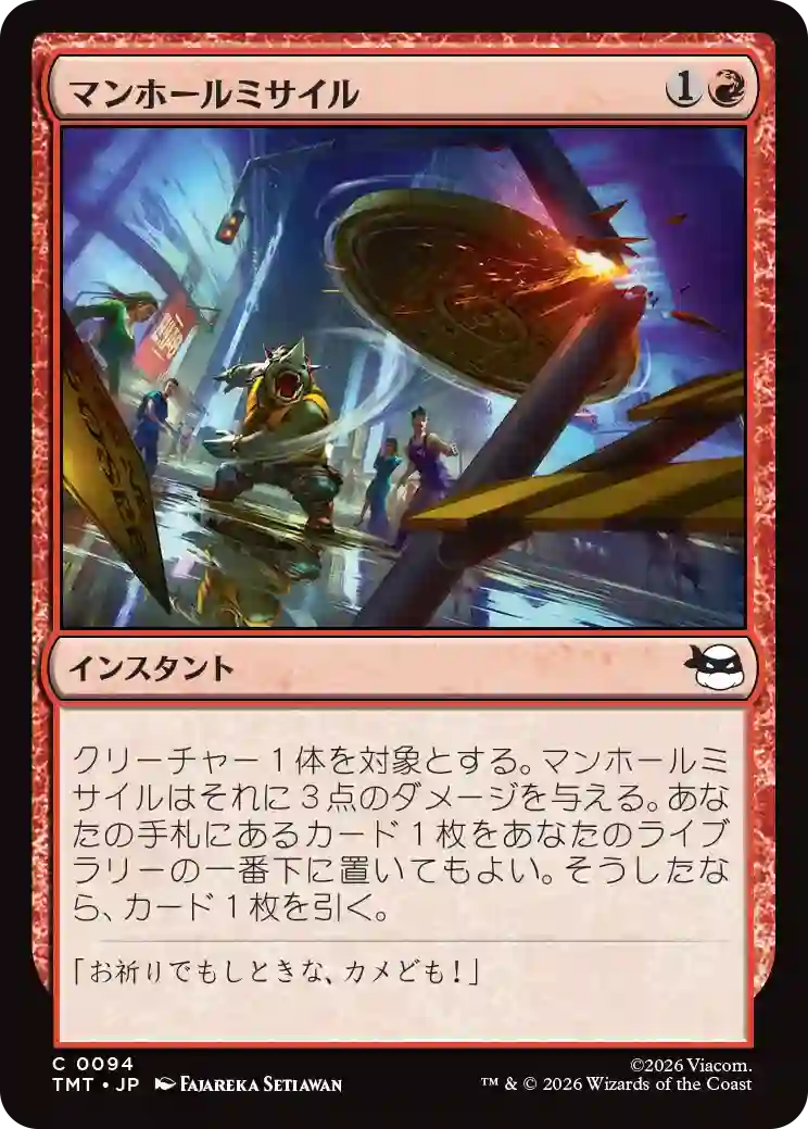 クリーチャー1体を対象とする。マンホールミサイルはそれに3点のダメージを与える。あなたの手札にあるカード1枚をあなたのライブラリーの一番下に置いてもよい。そうしたなら、カード1枚を引く。