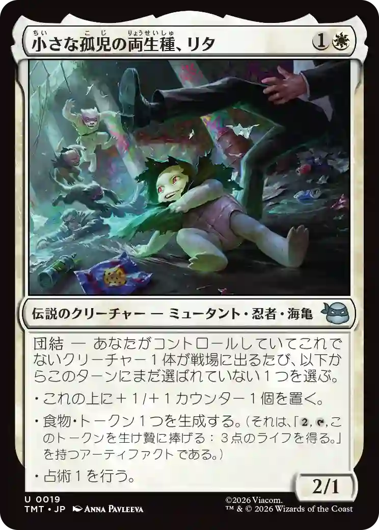 全体的にアンコモン以上のカードが強く、コモンが弱めな色なんですが、コモンでも《見習いくノ一、エイプリル・オニール》は優秀です。回避能力に占術付きと、コモンらしからぬ能力を持っています。