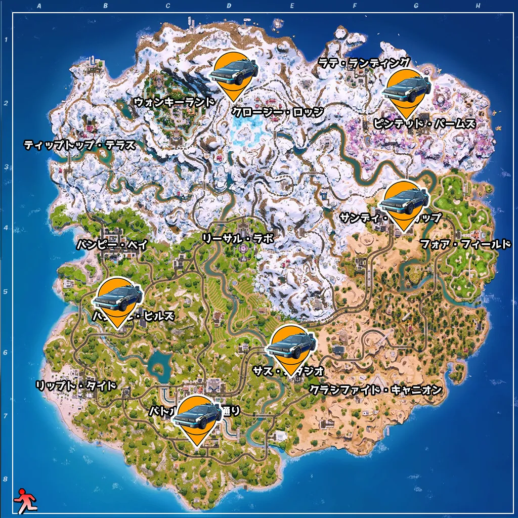 《デロリアン》は各地のスポーン地点に出現し、近隣の《デロリアン》の位置はマップ上に表示されます。