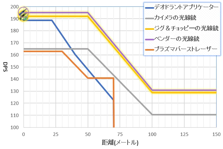 また《カイメラの光線銃》の派生である《ジグ&チョッピ―の光線銃》や、《ベンダーの光線銃》とDPS2は互角ですが、射程不足が目立っています。