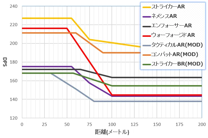 また武器MODを除いた基礎性能では、下手すると《エンフォーサーAR》の方が劣っているまでありました。DPS1こそ僅かに上回るものの、弾速による命中率の低下があるからです。
