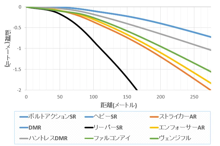 弾道の落下は旧時代のスナイパーより少し落ちますが、偏差が緩和されるので、遠距離で優れた命中率を発揮します。