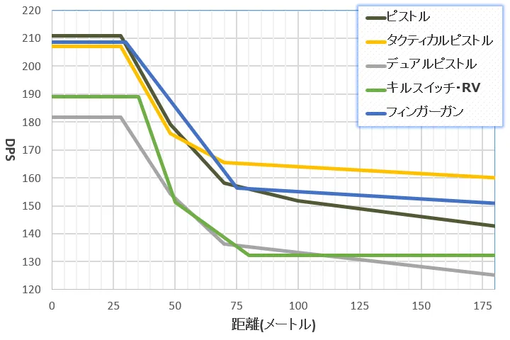 最大威力の射程などはピストル族らしいものですが、昨今続いているピストル強化の流れを踏襲しています。基本的には《ピストル》互換の状態であり、威力減衰が僅かに緩和されています。