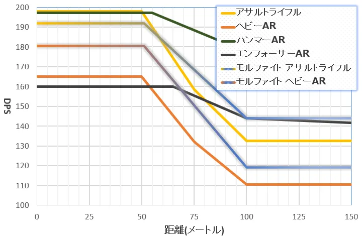 《M-アサルライフル》はそんな《ハンマーAR》に比べると全体的に性能が小粒であり、同じレアリティだとヘッドショット倍率くらいしか優位性がありません。射撃精度、減衰の差が大きいので、基本的には全距離で不利になります。