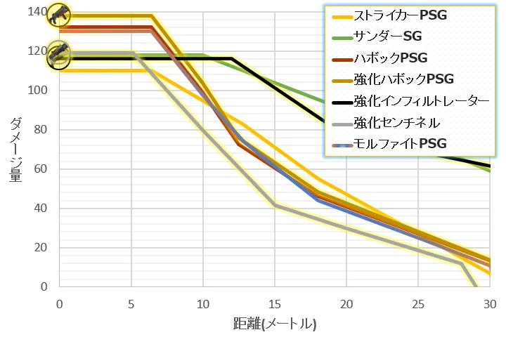 | 最大ダメージ | 101 (6.4m) 詳細:10.1 * 10 | 128 (6.4m) 詳細:12.8 * 10 | 100 (6.4m) 詳細:10.0 * 10 | 130 (6.4m) 詳細:13.0 * 10 | ||||||||||||||||||||||||||||||