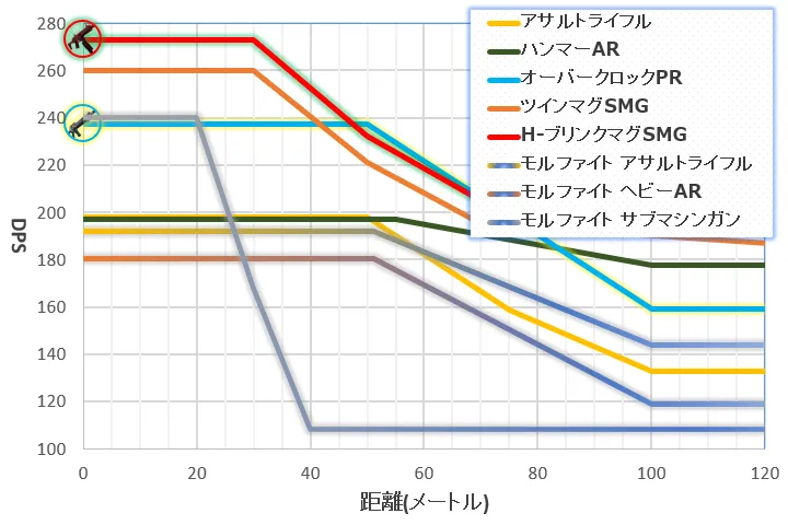 最小ダメージ7.2 (40m~)7.6 (40m~)8.1 (40m~)8.6 (40m~)9.0 (40m~)