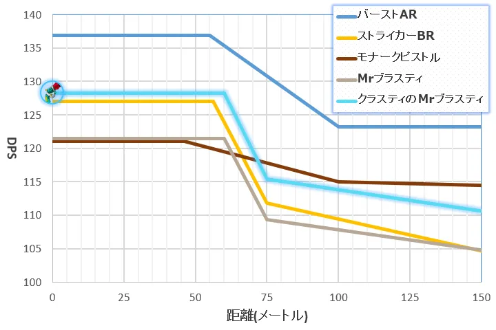 《Mrブラスティ》は《モナークピストル》と同程度のDPSを発揮しますが、最大威力を維持できる射程が短くなっており、遠距離での性能がかなり落ちます。