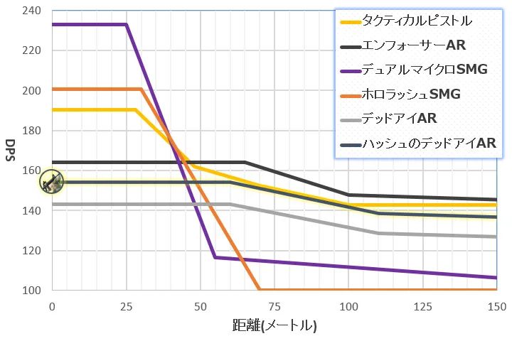 ヴェールドプレシジョンSMG》と同水準の火力があり、リコイルが減少した代わりに、威力減衰がかなり強くなっています。