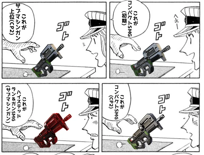 今更になって気が付いたのですが、《H-ラン&ガンSMG》は性能が《サブマシンガン》ベースなのに、見た目は赤くなった《コンパクトSMG(CP2)》という謎の武器だったみたいです。マズルブレーキの形が違う……。